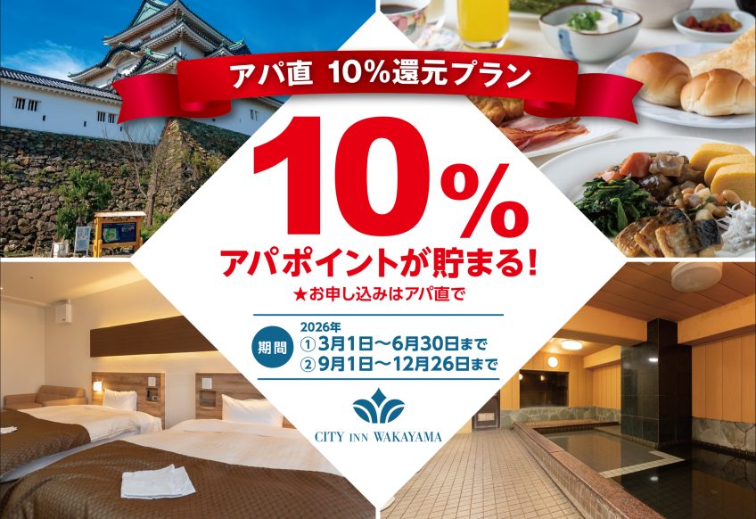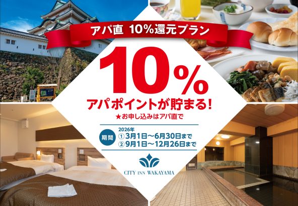 アパホテル会員の皆さま限定の特別キャンペーンとしまして、シティイン和歌山にご宿泊いただきますとアパポイントがなんと10%貯まります。お値段もお安くなっていますので、ぜひこの機会に当ホテルをご利用くださいませ!有効期間:...
